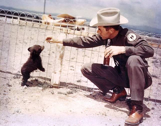 3. Petugas keamanan bermain bersama beruang tahun 1950.