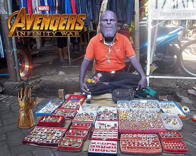 2. Kalau dilihat-lihat, warna kulit Thanos dan seragamnya mirip gethuk lindri, ya~