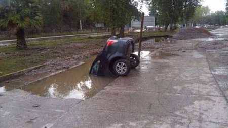Orang ini mungkin tak menyadari jika yang dikiranya hanya genangan air rupanya sangat dalam.