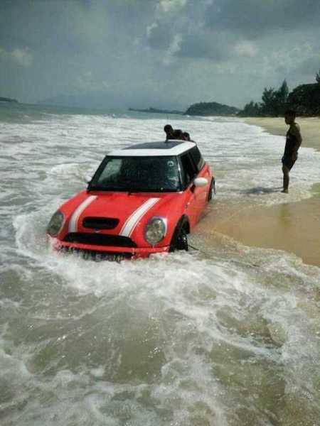 Mini Cooper ini mungkin ingin sekalian mandi di laut, biar seger.