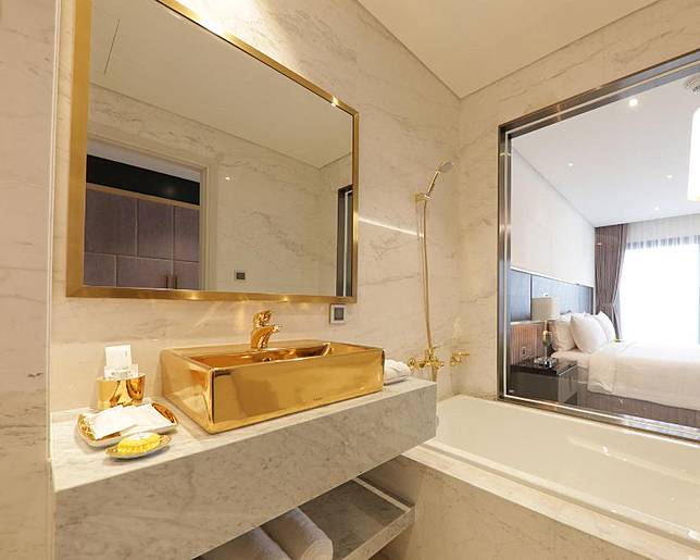 Hotel Danang Golden Bay di Vietnam menyediakan kamar mewah yang tak biasa. Kemewahan tersebut tercermin dari fasilitas yang tersedia di kamar tersebut. Dari bathtub bahkan toiletnya, semua berbalut emas lho.
