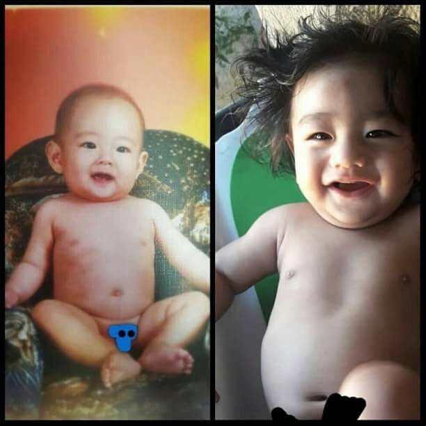 Kalau dibandingkan sama foto V sendiri waktu bayi, jadi kayak kembar ya?