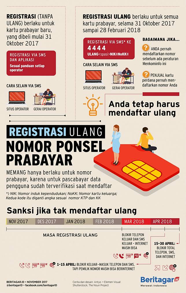 Infografik tahapan registrasi dan registrasi ulang nomor ponsel prabayar.