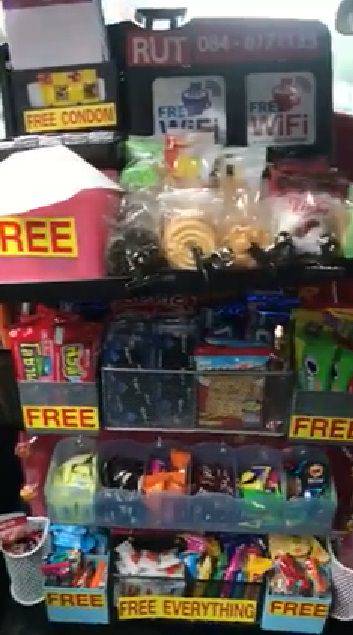 Mulai dari biskuit, permen, camilan, minuman tersedia secara cuma-cuma untuk penumpang.