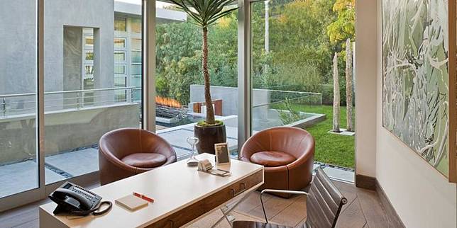 Tak cukup hanya di situ. Rumah ini juga dilengkapi berbagai fitur fungsional seperti infinity pool bertingkat, dan kolam hias dengan desain wahana yang memungkinkan air bergerak secara rumit. Kantor di bagian belakang rumah.