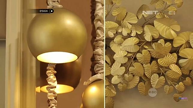 Warna emas menjadi pilihan warna lampu gantung dan hiasan pada headboard.