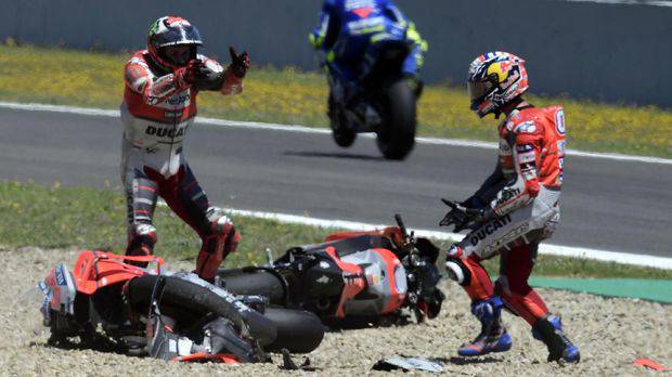 Dua pebalap Ducati, Andrea Dovizioso dan Jorge Lorenzo, serta pebalap Repsol Honda Dani Pedrosa menyelesaikan balapan MotoGP Spanyol setelah terlibat kecelakaan di lap ke-18.